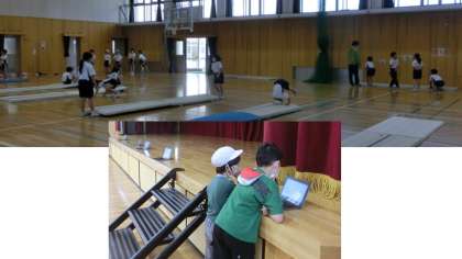 体育はマット運動です。技のポイントを端末で確かめたり、自分のめあてに沿った場で練習したりします。