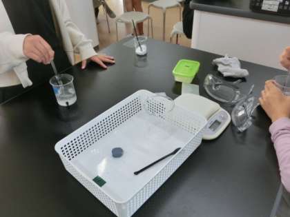 理科では、ものの溶け方の学習です。ミョウバンが水に溶ける量を増やすためには、水を増やす?温める?など、予想を立ててから、実験で検証します。