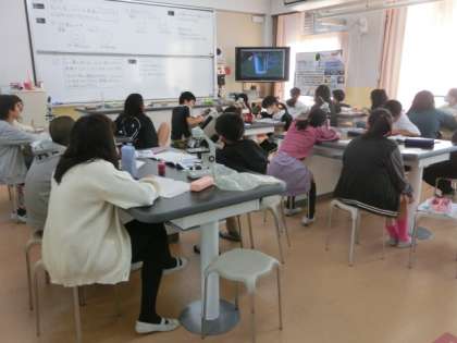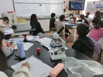 理科では、水溶液にとけこんだものを取り出せるか?を考えました。実際に塩水を蒸発させ、顕微鏡で確認します。塩の結晶は見ることができたかな?
