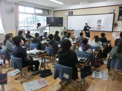 書写では「理想」という字を毛筆でしたためました。字の大きさや組立、点画のつながりや余白を意識して書きました。
