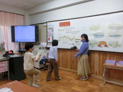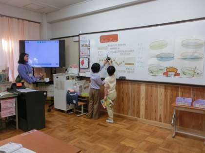 音楽で、鑑賞の学習をしました。曲を聞いた感じを、音楽の言葉で表したり、音の上がり下がりを図と音符をつかってイメージしたりします。身体を動かすことも、音楽の感じをとらえやすくなるようです。