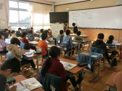 国語科では「三年とうげ」を読みました。お話の組み立てをとらえて民話を紹介する、というめあてに向けて学習を進めていきます。