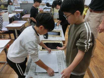図画工作科では、版画に取り組んでいます。刷るときは、なんだかドキドキします。
