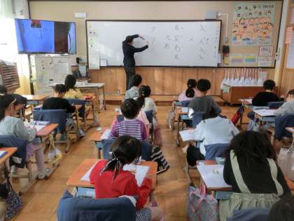 国語科、漢字の学習です。丁寧に書いています。また「ものの名まえ」では、おみせやさんごっこを通して言葉ややりとりの仕方を学習しています。