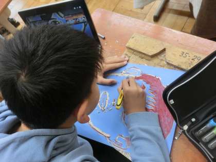 図画工作科で木版画を彫り始めました。彫刻刀の扱いに気をつけながら、丁寧に彫り進めます。
