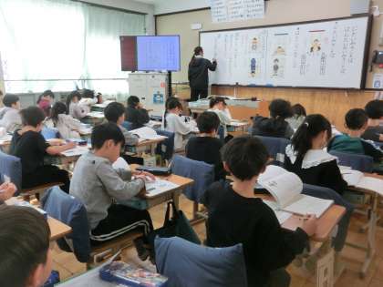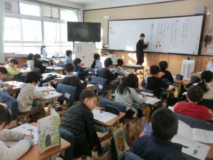 国語科「にたいみのことば、はんたいのいみのことば」の学習です。「話す」と「言う」などの似た意味の言葉や、「大きい」と「小さい」のような反対の意味の言葉について考えました。