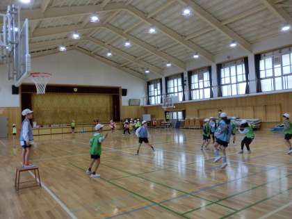 体育科のポートボールでは、ゲームが始まりました。声をかけあい、チームで協力してプレーしています。安全面の注意もしっかりと心がけています。