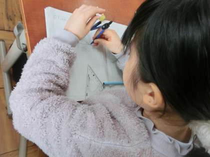 算数科では、コンパスを用いて二等辺三角形をかきました。コンパスの使い方も練習です。