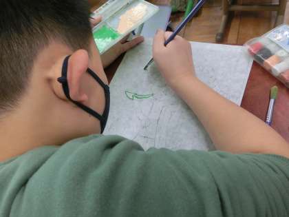 図画工作科では、版画の作品に彩色しています。裏から色をつけ、表を確認しながら、作品を完成させていきます。