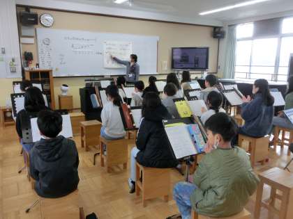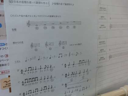 音楽科では「日本の音階を使って旋律を作ろう♪」というめあてで音楽づくりの学習活動です。例示された音階やリズムを組みあわせて音楽を楽しみます。