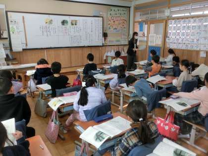 国語科「たぬきの糸車」では、たぬきのしたことや気持ちを想像しながら読み、まとめています。