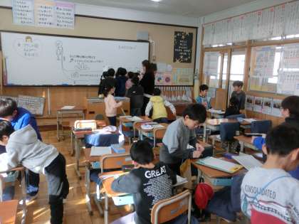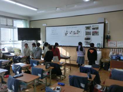 生活科のまちたんけんで、校区の色々なお店にインタビューに出かけました。写真は、教室でインタビューの練習や打合せを、念入りに行っている様子です。とっても上手で、準備万端。インタビューは大成功だったようです。