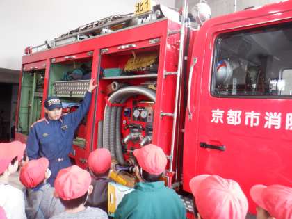 「火事をふせぐ」の単元で、「消防士はどのようにして火事をふせいでいるのだろう」という学習課題をもち、北消防署に社会見学に行きました。普段見ることのない消防署の内側を案内していただいたり、消防車の種類や装備を教えていただいたりと、たくさんの火事をふせぐひみつを知ることができました。