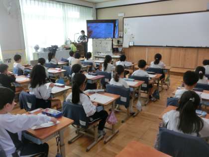 体育科では「ゆっくりかけあし」と「なわとび」に取り組みます。学習カードを使って、学習の流れや気をつけることを確認しました。