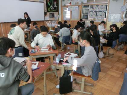 図画工作科では、卒業記念の写真立てを作成中です。思いを込め、穏やかな雰囲気の中で、丁寧に彫り進めています。