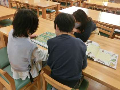 学校図書館で、司書の先生と一緒に絵本をみました。細かいところまでよく見ることができています。
