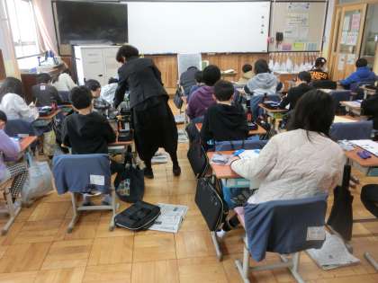 書写では、毛筆の小筆を使って、自分の名前を書きました。小筆でも縦画や横画など、字形を意識して丁寧に書きます。
