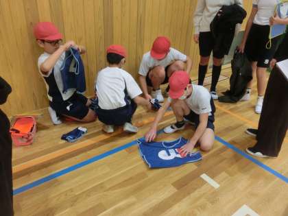 体育科はサッカーの学習です。学習の後は使ったビブスをたたむなど、片付けもしっかりと行います。