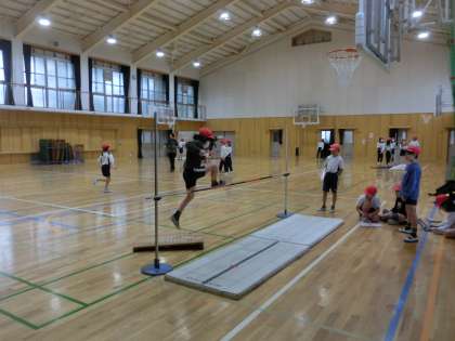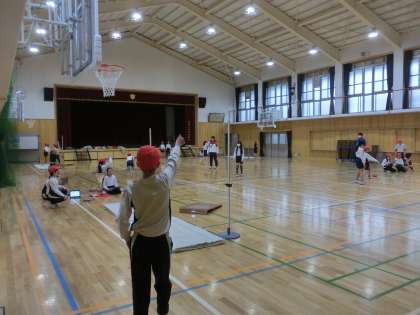 体育科では走り高跳びに取り組んでいます。動画に撮って確認したり、友だちどうしでアドバイスしあったりして、うまく跳べた時には拍手もあがります。