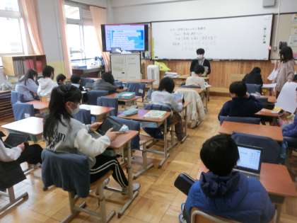 社会科では来週、国際交流のさかんな舞鶴市について調べたことの発表会を行うので、発表に向けた準備をしています。