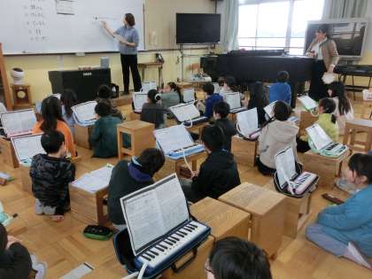 音楽科では「ジッパ ディー ドゥー ダー」の合奏です。様々な楽器の音色を確認しました。