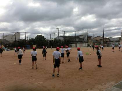 体育科で、体育館ではサッカー、運動場ではタグラグビーの学習です。