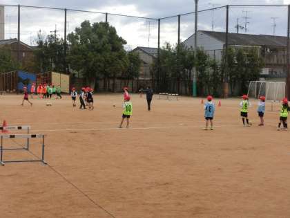 体育科はボールけりゲームに取り組んでいます。とても元気な声であいさつしたり、声をかけたりして活動しました。