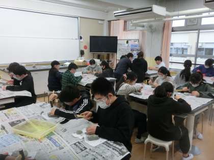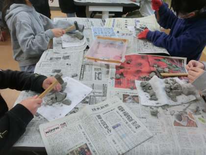 理科では、化石の彫出しを行いました。教員が用意した化石の入った石をトントンと丁寧に彫り出します。