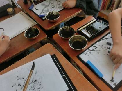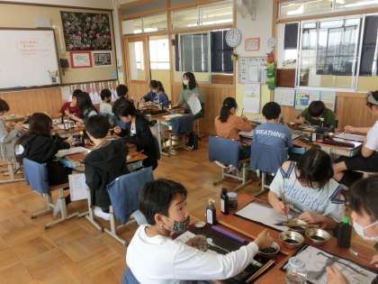 図画工作科では「すみと水から広がる世界」に取り組み、四季の風景を、すみと水で表しました。みんな作品の世界に入り込んで描きました。