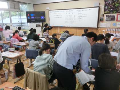 算数科「文字と式」の学習で、「xの値が小数の時のyの値」を考えました。xとyの関係を式に表し、調べます。これまではわからない数値を□や△を用いて考えてきましたが、それを文字に置き換えるようになっています。文字を用いることに慣れると、中学校に進学してからも戸惑いにくくなります。