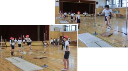 体育科「走り高跳び」の学習では、自身のめあてをそれぞれに意識して、場を選びます。同じ場の友だちとアドバイスをしあいながら、練習しています。