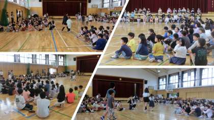 2〜5年生が待つ体育館に、1年生が6年生と手をつないで入場。5・6年生の本部役員が進行やはじめ・おわりの言葉をきっちりと務め上げてくれました。