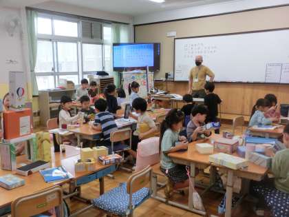 算数科「いろいろなかたち」では、実際にいろいろな形の箱を用いて、形の特徴を体感でとらえました。
