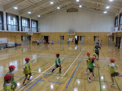 体育科では「エンドボール」の学習が始まりました。まずはルールやゲームの進め方に慣れます。その中で動きやパスを工夫していきます。
