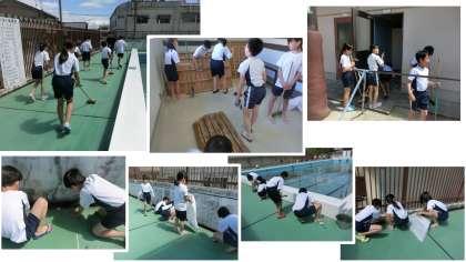 まずは5年生が、更衣室やトイレ、プールサイドや腰洗い、シャワー周りをきれいにしてくれました。