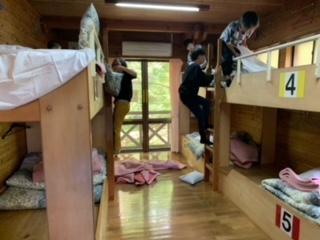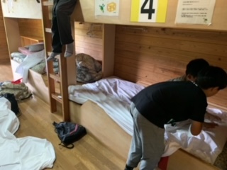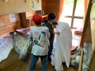 部屋に入り、寝具準備です。苦戦しながらも協力してがんばっています。