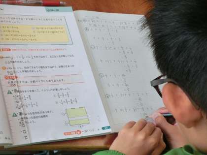 算数科では、これまでに学習してきた「計算のきまり」が、分数の計算でもあてはまるのか、を確かめました。