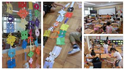 図画工作科「ちょきちょきかざり」の学習です。紙の折り方や切り方を工夫して、個性豊かで素敵なかざりをつくりました。