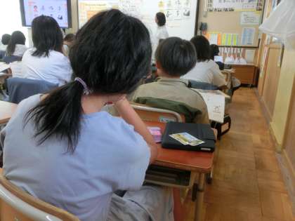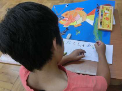 交流で外国語の学習をしたり、音楽の学習をしたり、理科の学習をしたり。また、教室ではそれぞれのペースでおさかなの絵を仕上げています。
