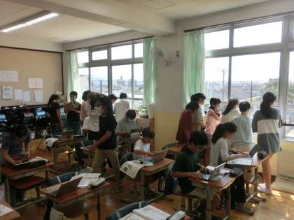 家庭科「夏をすずしくさわやかに」の学習では、教室の中で、空気の通り方や風の感じ方、音の大きさなどを調べました。そうした条件によってどんな工夫が有効かな…と考えていきます。