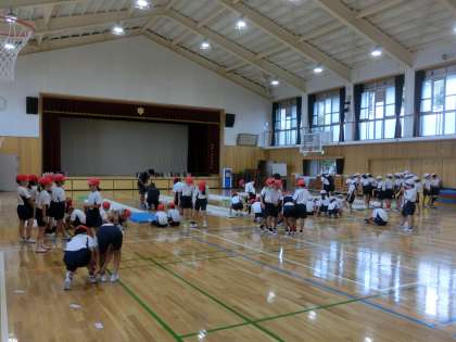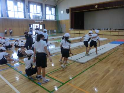 運動会に向け、二人三脚の練習です。丁寧に、安全に取り組んでいます。いちに、いちに、と声と息を合わせます。