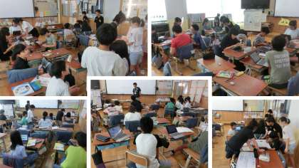 6年生は、算数科「四角柱や三角柱の体積の求め方」、外国語「夏休みの思い出を伝え合うために絵日記をかく」、道徳「前向きに生きることについて考えよう」といった学習や、図画工作科のお話の絵に向けてメモを取りながらお話を聞いたり、家庭科で洗濯した服を取り込んだりといった活動も行いました。