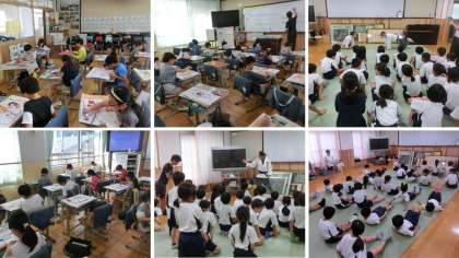 図画工作科で取り組んでいるお話の絵。彩色の段階に入っています。どうすれば自分の思いを表現できるか、いくつかのポイントに気をつけながら彩色しています。