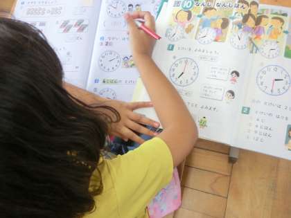 算数科「なんじ なんじはん」では、時計の学習をしています。針の位置をしっかりと確認しながら、時計を読みます。