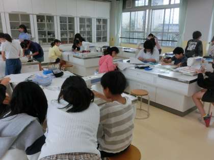 家庭科では、ナップザックを制作しています。ていねいにしるしをつけ、ミシンで縫っていきます。修学旅行でも使うので、丈夫につくっています。
