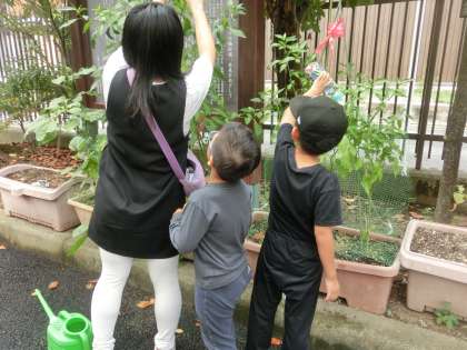 育てている作物の水やりや観察です。成長の様子を確認するとともに、しっかりお世話もできました。