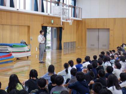 避難後は、体育館で北警察署のスクールサポーターさんから不審者対応について教えていただきました。