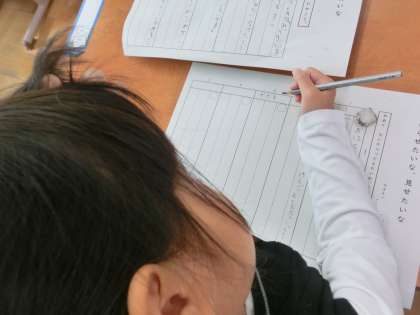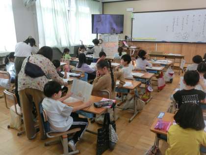 国語科「しらせたいな、見せたいな」の学習では、学校で見つけたものについて、お友だちに文章で紹介します。何から伝えたいのか、順番も意識して書いていきます。