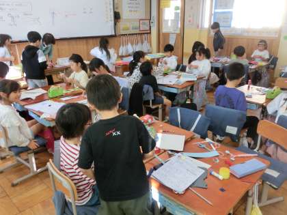図画工作科「パタパタ ストロー」の学習では、動く仕組みを使って、素敵な飾りつけをつくります。お友だちと声をかけあいながら取り組んでいます。