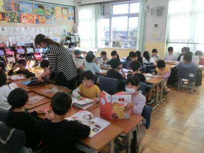 国語科では「すがたをかえる大豆」の学習の一環で、関係図書をみんなで読みました。似た話題の色々な本に触れ、学びを広げます。